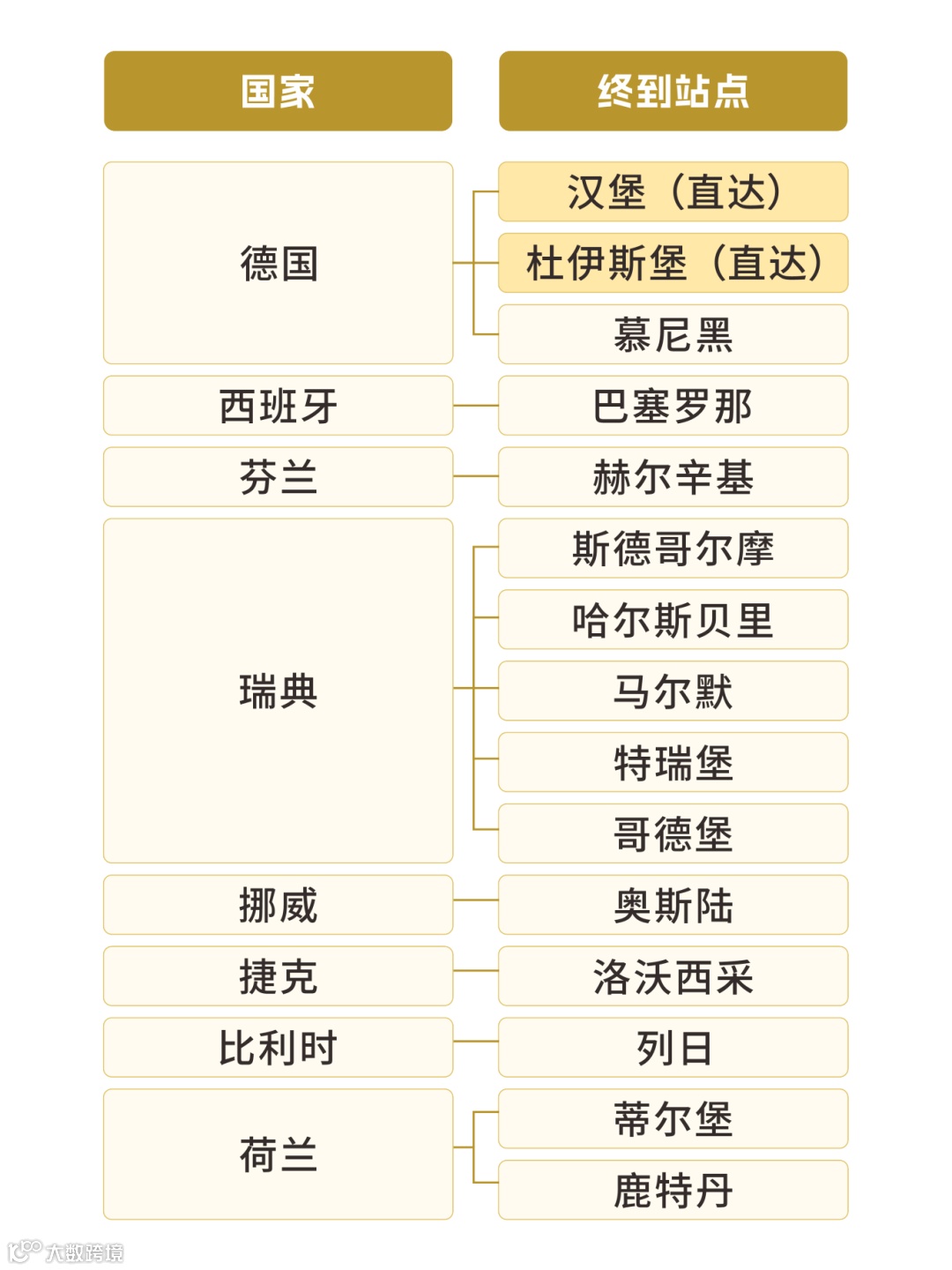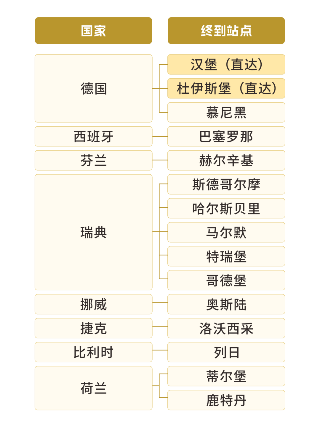 2023年至今,我司探索创新中欧班列“全程时刻表+”分拨模式,在现有去程班列基础上增加分拨站点,目前已辐射至北欧、西欧、南欧,实现多站点相结合,提供班列前端、末端等全链条服务,精准覆盖欧洲地区。