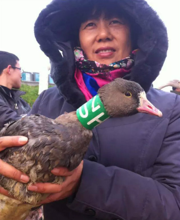 2013年12月份,志愿者在采桑湖放飞救助的小白额雁,放飞前进行了环志。 摄影/彭祥林