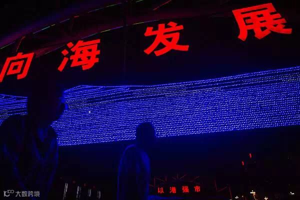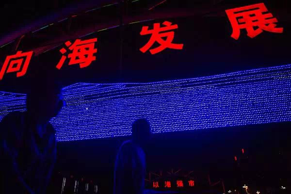 2014年9月6日,辽宁省盘锦市,夜晚中的霓虹灯上写着“向海发展”。 澎湃新闻记者 孙湛 图