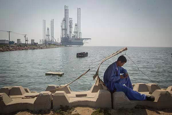 辽宁盘锦,写有“向海发展”的大型灯箱伫立在去往滨海的路中。在昔日小渔村二界沟一处居住社区建设工地旁,当地一位退休干部饶有兴致的看着这一切。在他眼里,渔村正发生着惊人的变化,陆地向大海延展开去,高楼和工厂从无到有,“这是发展,谁不理解,证明你头脑落后。”他说。