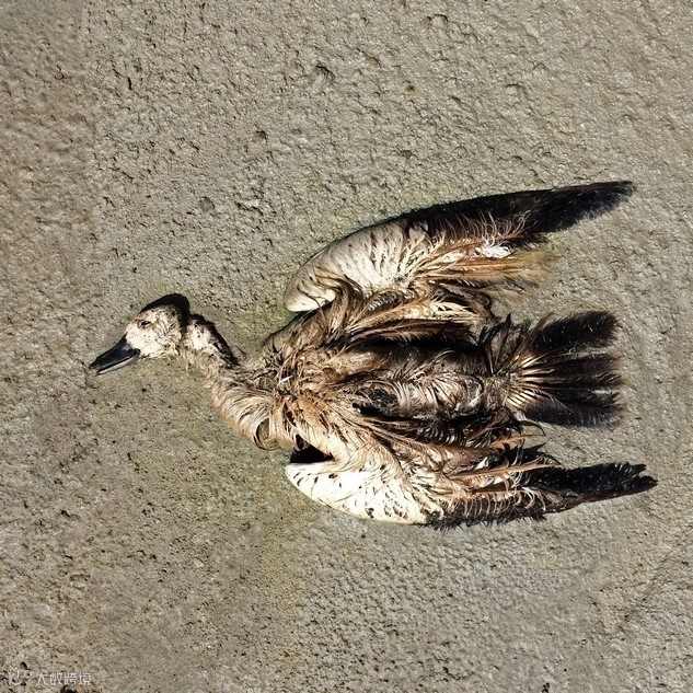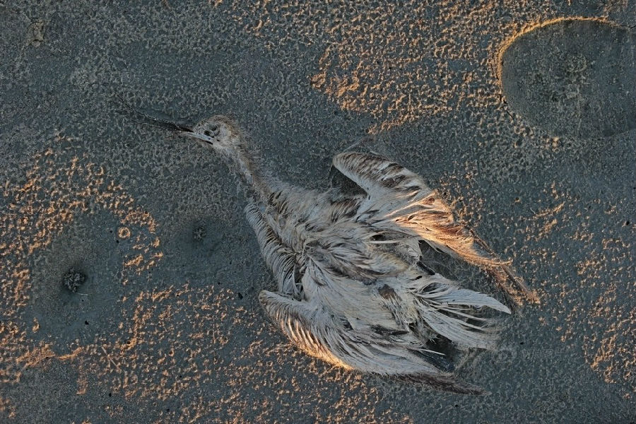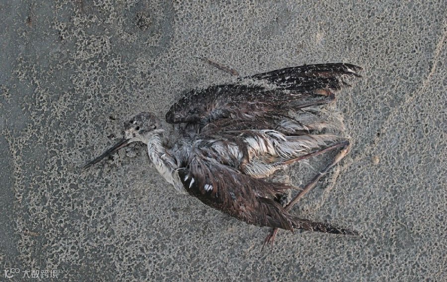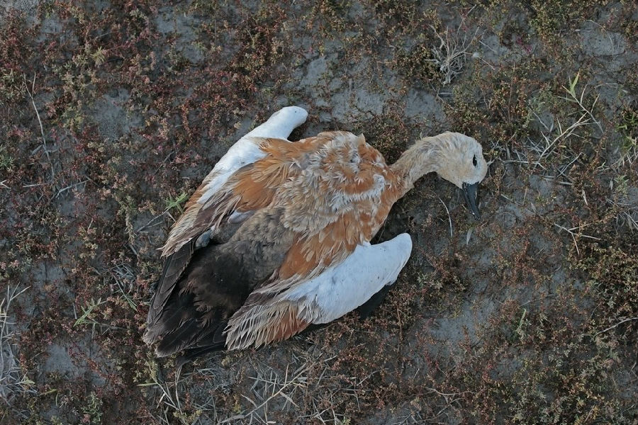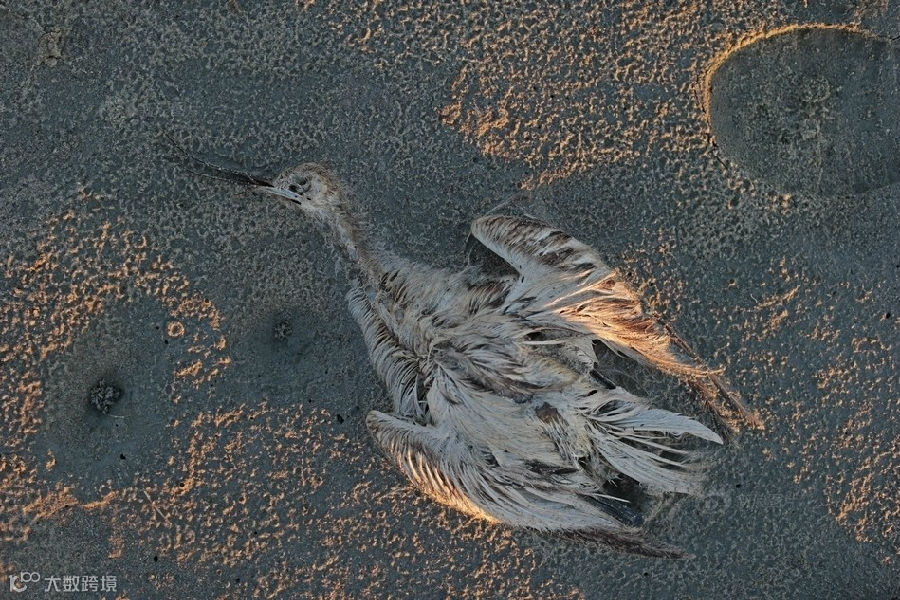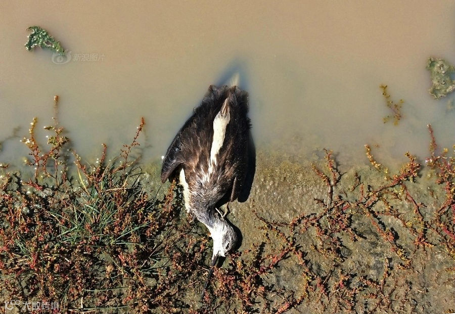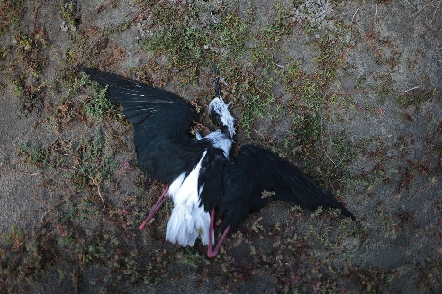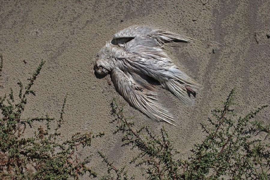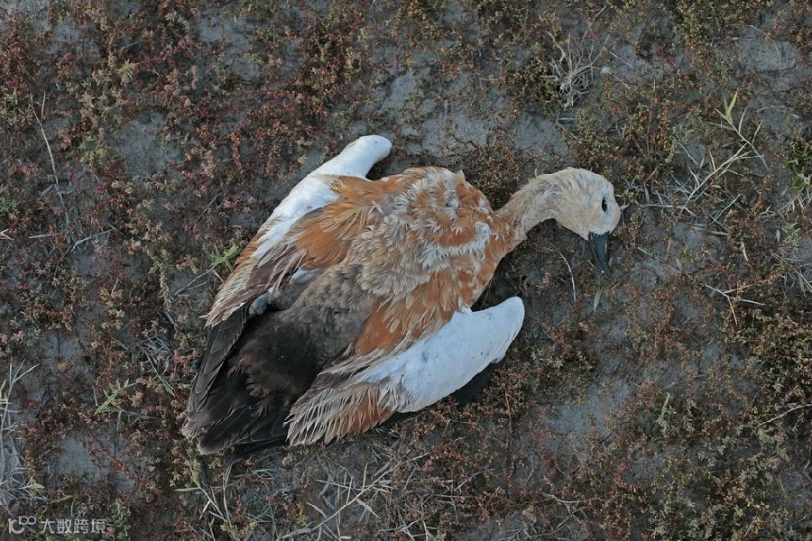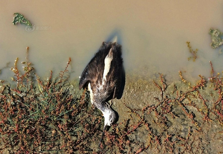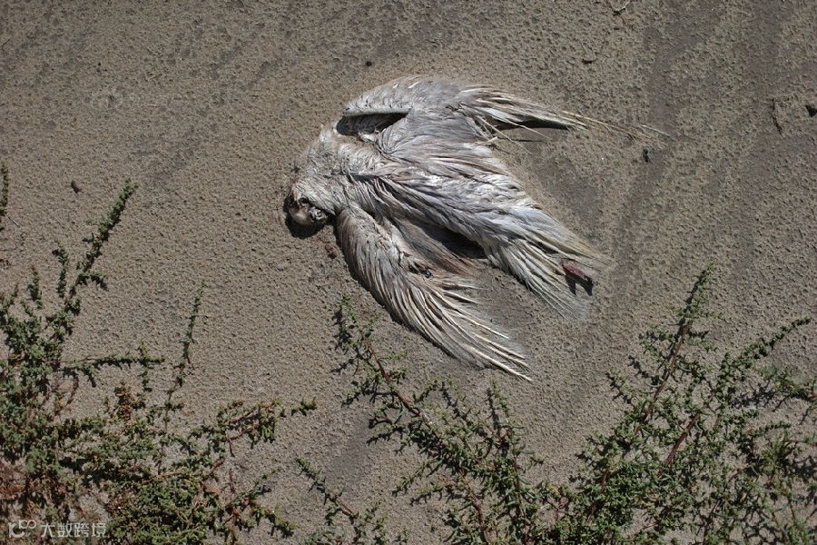 查汉淖尔湖边的沙滩上,一只死去不久的鸟儿。这些死去的鸟儿中,有黑翅长腿鹬、白鹭、赤麻鸭、反嘴鹬等等十多种各类国家各级保护鸟类。