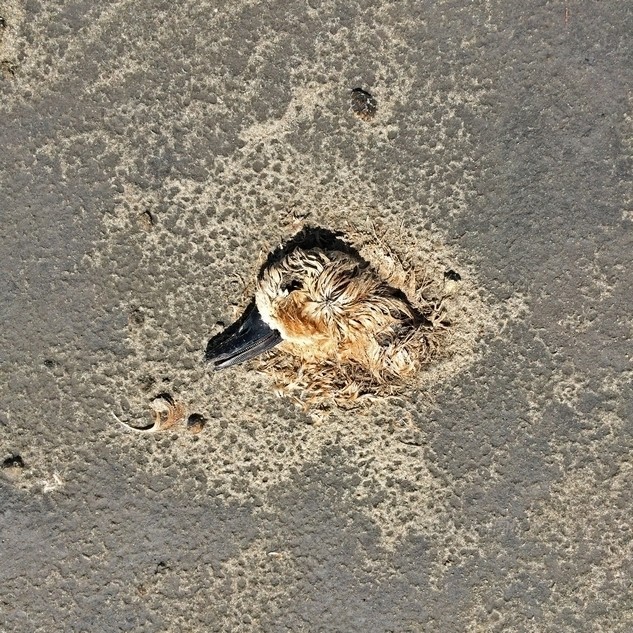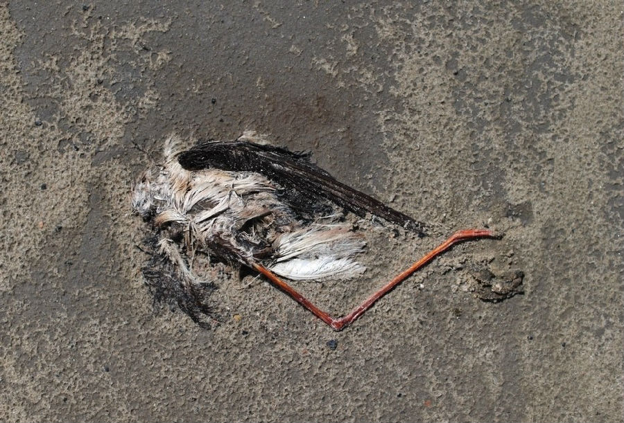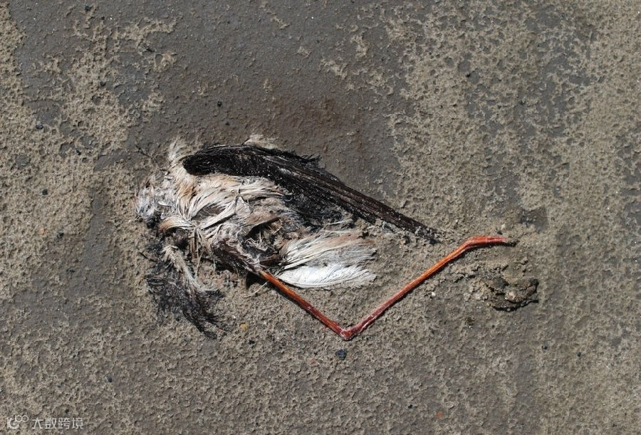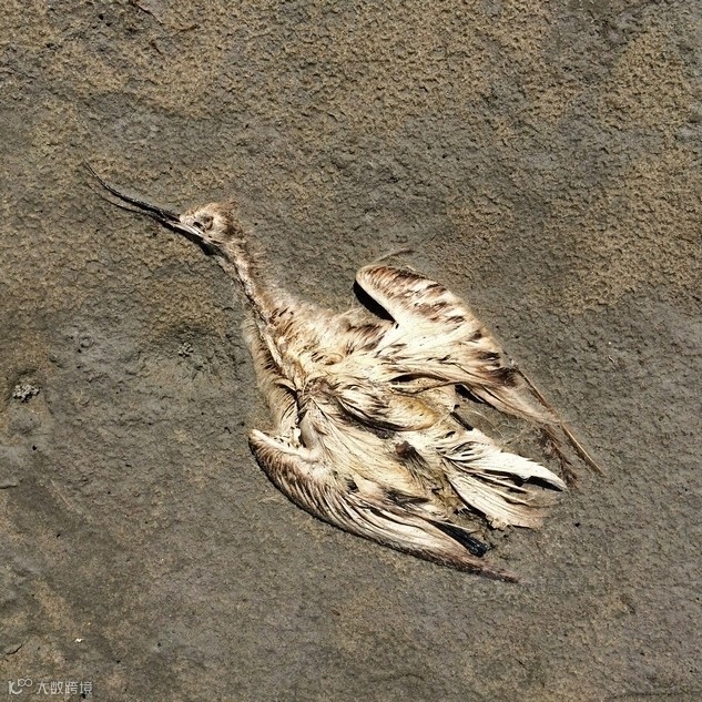 查汉淖尔湖边的沙滩上,一只死去的鸟儿,肢体残缺。