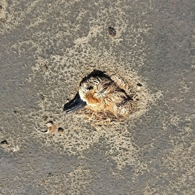 查汉淖尔湖边的沙滩上,一只死去的鸟儿。