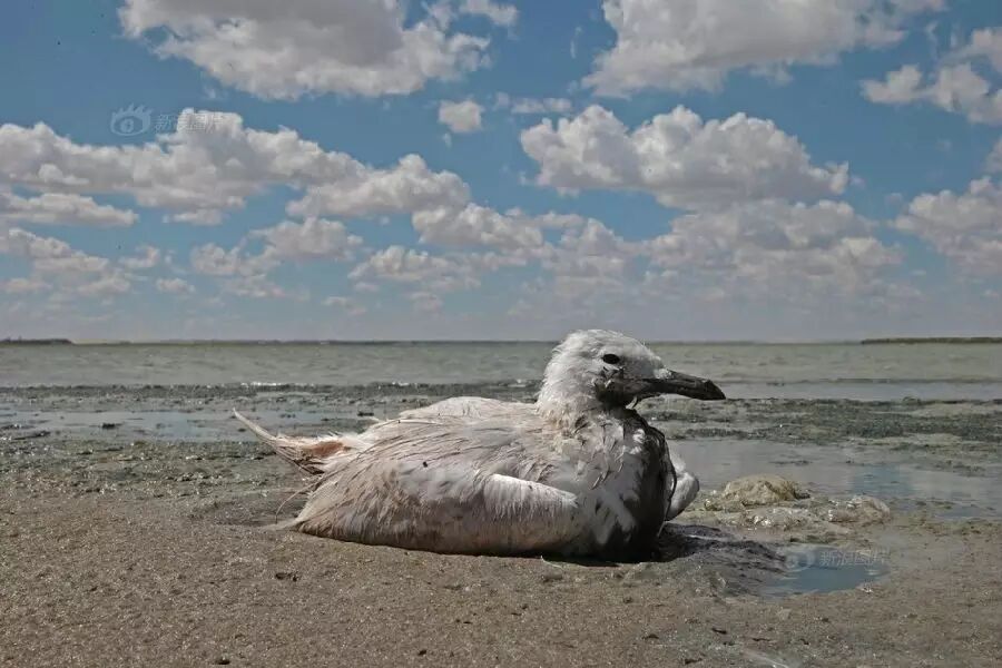 查汉淖尔湖,在湖边淤泥中挣扎着的中毒的鸟儿。