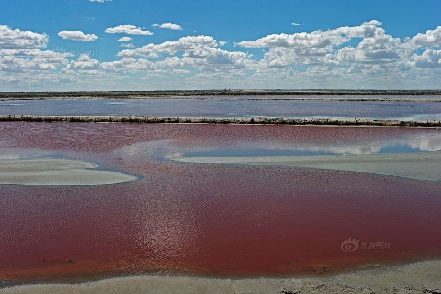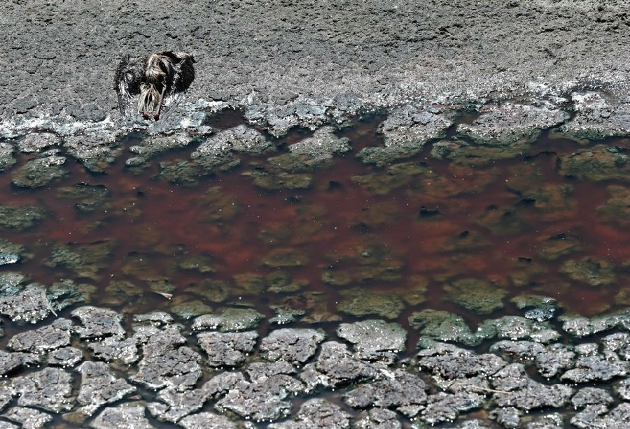 查汉淖尔湖一废弃的处碱池内污黑发臭的污水。查汉淖尔湖湖面被一条堤坝分成南北两部分,低洼的南侧湖水较少,呈暗红色,气味较淡。北侧湖水则几乎溢出堤坝,暗黑色的湖水上漂浮着五颜六色的泡沫,泡沫里面时隐时现一些腐烂鸟儿的尸体,一股臭味扑面而来。