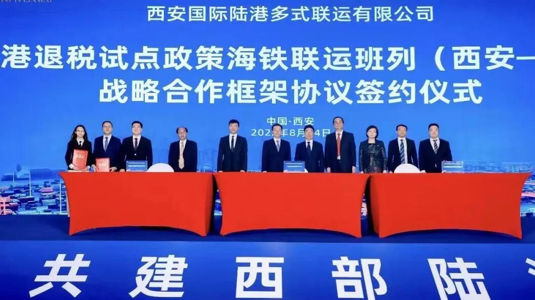 为深入实施全国首个陆路启运港退税试点政策,共享西部陆海新通道发展机遇,在第六届丝博会隆重召开之际,8月14日下午,在西部陆海新通道暨陆路启运港退税试点政策广西推介会上,西安国际陆港集团多联公司、广西北港物流有限公司和陕西兴洲纺织科技有限公司共同签订了陆路启运港退税试点政策海铁联运班列(西安—北部湾港)战略合作框架协议,并实时连线“西部陆海新通道陕桂海铁联运常态化班列”发车仪式现场,此趟班列的开行标志着西部陆海新通道(西安—北部湾港)海铁联运班列实现常态化运行。