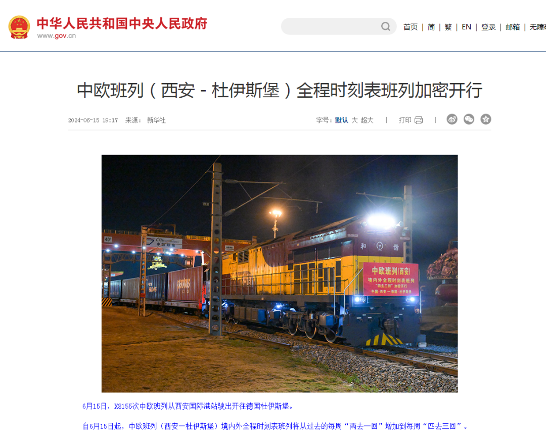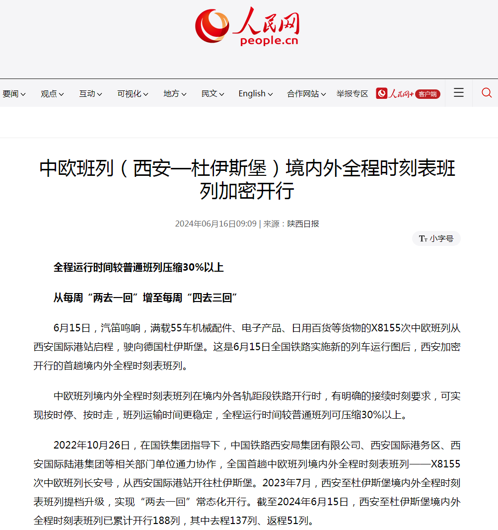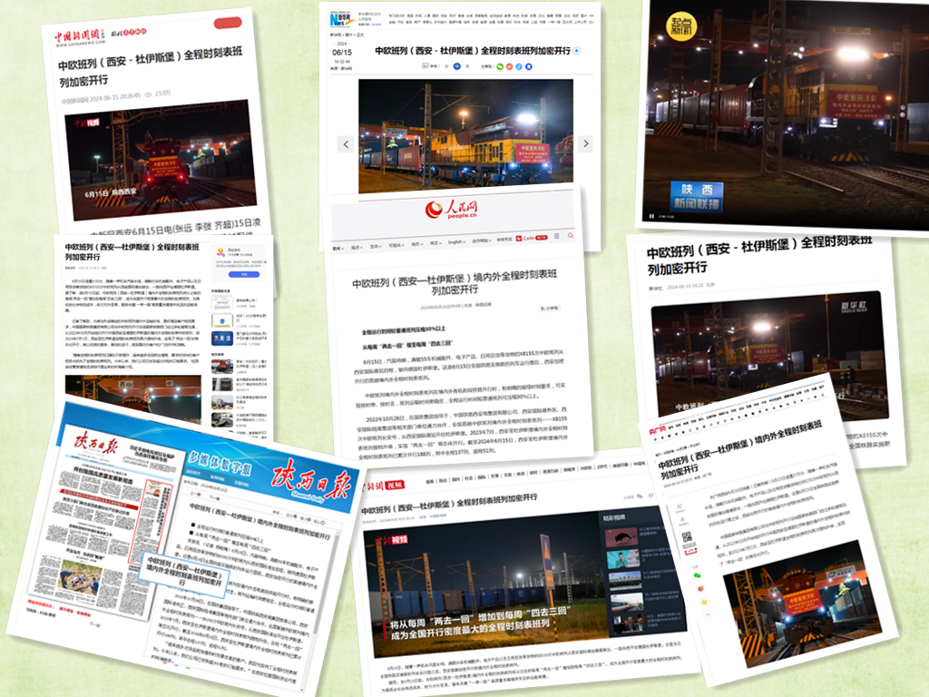 中欧班列(西安—杜伊斯堡)境内外全程时刻表班列由西安国际陆港集团多式联运公司运营,目前加密开行后升级为“四去三回”,去程班列每周二、周三、周五、周六,回程班列每周二、周三、周四,在保证运输时效的同时,运能实现翻倍,全程时效约12天,目前成为了全国开行密度最大的全程时刻表班列。有效提升了中欧班列全程开行质量和中欧班列的市场竞争力,大大减少了企业成本,高效快捷的完成运输任务。