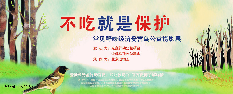 2014年夏天,让候鸟飞公益基金与光盘行动公益项目联合多家公益组织发起“2014不吃就是保护”大型公益活动,并有幸邀请到国家食品药品监督管理总局新闻宣传司、卫生部新闻宣传中心、环保部宣教中心作为指导单位,计划在全国护鸟伙伴所在城市展开活动。