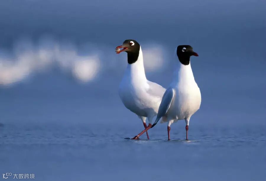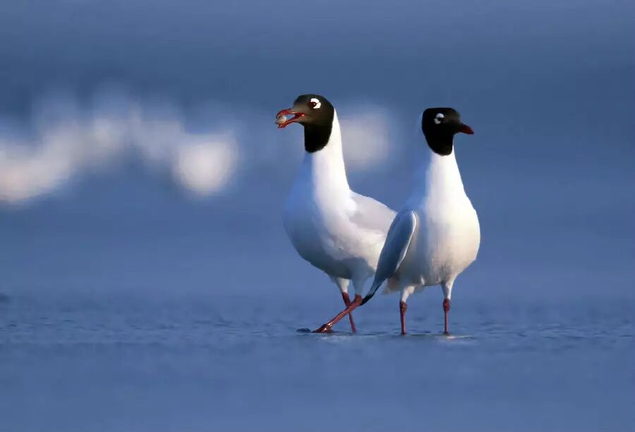(2012年4月5日,一对美丽的遗鸥闯进了我的镜头,它们相互依偎,情意绵绵。画面中,雄性遗鸥捉到一只小白蛤殷勤地献给自己的恋人。)