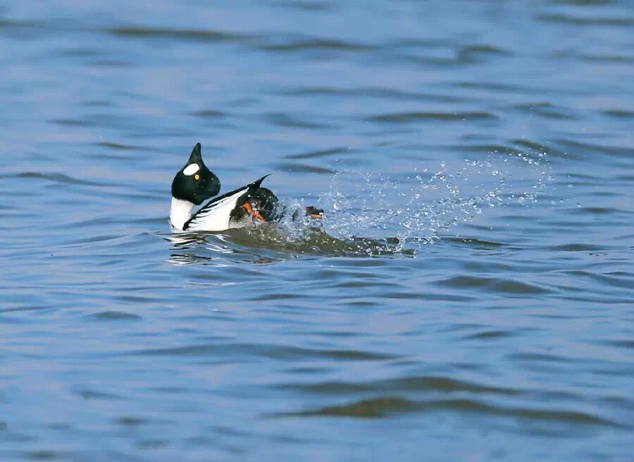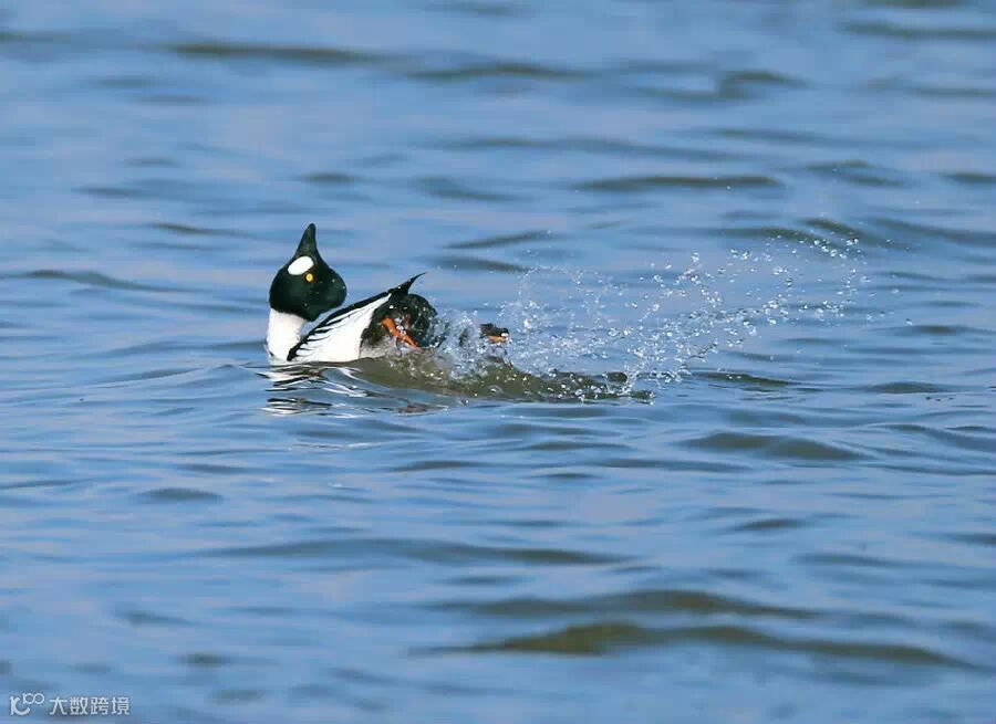 (2014年3月15日,为了拍摄可爱的鹊鸭,我早早地蹲守在北大港湿地的万亩鱼塘东岸,经过一个多小时的静静蹲守,我拍到了它典型的蹬水镜头。)