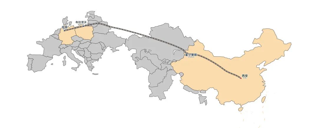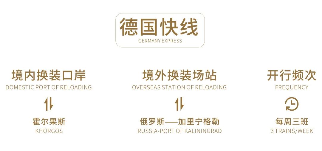 2019年10月5日,由西安国际陆港多联公司与DHL全球货运(中国)有限公司合力开发的“德国快线”从西安首发,作为首列中国——德国点对点快速班列产品,“德国快线”经霍尔果斯口岸出境并换装,途经哈萨克斯坦、白俄罗斯,在俄罗斯的加里宁格勒二次换装,进入欧洲境内。这条由西安国际陆港多联公司运营的“德国快线”,每周定期从西安发车,仅用10至12天即可抵达约9400公里外的德国纽斯,是目前全球最快的中德货运国际铁路运输通道。