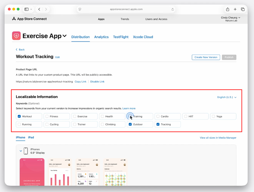 据介绍,自定产品页的关键词来源于App在App Store的最新版本,也就是说我们不能“随意”创建自定产品页的关键词,而是需要从App最新版本的关键词中进行挑选并分配给特定的自定产品页。