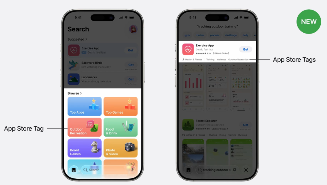 除此之外,为了提高标签的可发现性,这些标签将可以展示在App Store的关键区域,比如在搜索标签页面与App类别一起展示,并在搜索结果中与App一起展现。