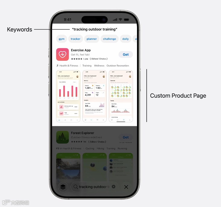 ②为自定产品页分了关键词后,当App出现在这些关键词的搜索中时,会显示自定产品页面,而不是默认页面。