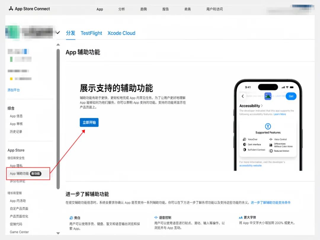 目前该功能Beta版已在App Store Connect上线,点击左侧菜单栏中的【App辅助功能】后,我们即可看到对于该功能的介绍。