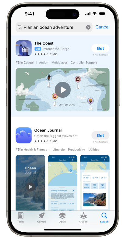 除了新增App标签,App Store搜索的另一个重磅变化是支持自然语言搜索,即用户可以使用日常用语来描述自己想要的内容,或者查找特定的特性或功能,以在搜索结果中找到更准确、相关度更高的结果。