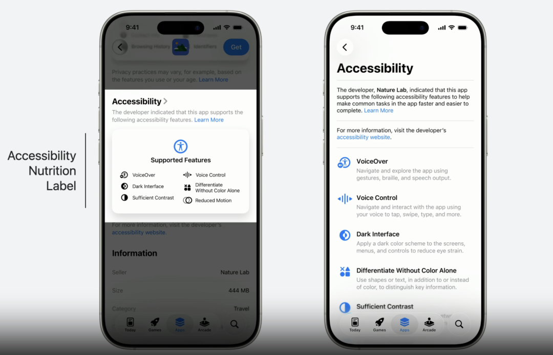 ②苹果官方信息介绍,自今年秋季起,辅助功能标签会被App Store添加为搜索词。例如,当用户搜索“支持旁白的笔记App”或“支持更大字体的跑步App”时,系统将优先展示已注明支持上述功能的App。这个变化将会对搜索和App的曝光产生影响。