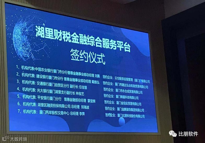 出席本次会议签约的企业有:厦门比朋科技股份有限公司、云仓配供应链管理(厦门)有限公司、厦门市建达弘业轮胎贸易有限公司、厦门市永合成贸易有限公司、厦门锦厦科技有限公司、厦门金信实贸易有限公司、厦门金腾装饰集团有限公司。