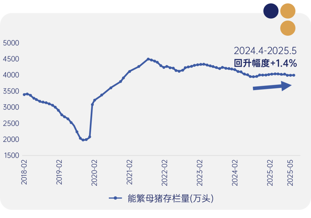 盈利层面,行业目前处于微利状态,自繁自养头均利润尚未跌至盈亏线下方,而断奶仔猪销售仍有不错盈利。在盈利驱使下,生猪产能处于上升通道,但回升缓慢。截至2025年6月,行业能繁母猪存栏为4043万头,高于3900万头的正常保有量。