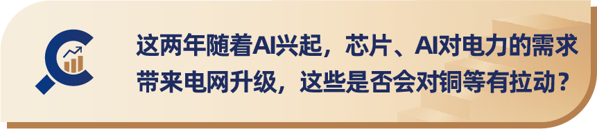 铜下游最大的使用场景是在电网、电力设备等领域,其次是家电、电子、机械、汽车等,未来AI数据中心是一个较大增长点。从AI用铜的价值量占比来看,现在60%-70%左右来自于芯片相关的制程硬件,30%-40%左右来自电力设备相关。支撑一个AI数据中心运营需要大量的不间断电源,配电设备会用到很多铜相关的材料,所以它应该是值得期待的市场。