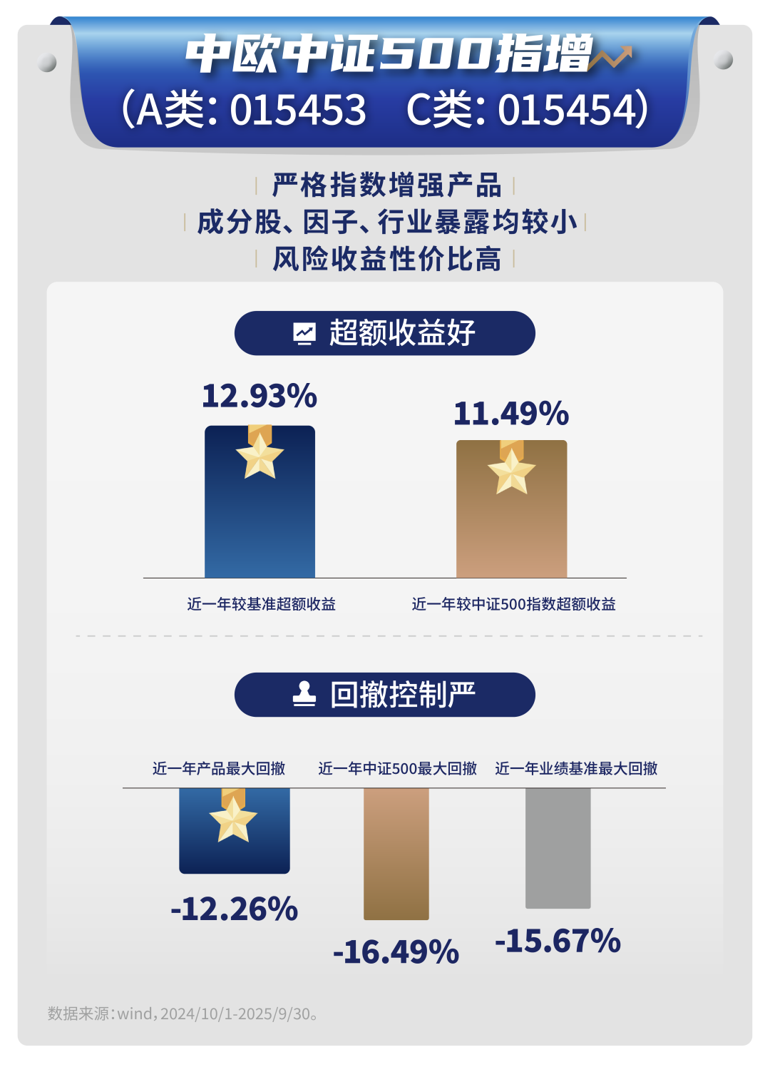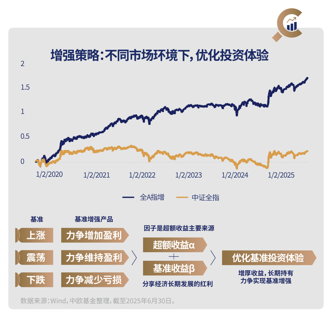 除了策略逻辑的差异,Alpha的另一个重要区分维度在于选股范围——是在指数成分股内,还是可以延伸至全市场。以中欧基金产品为例,量化指数增强和基准增强就体现了这一区别。一般公募基金的指数增强产品都要求投资于标的指数成份股及其备选成份股的资产不低于非现金基金资产的80%,这类产品的核心目标和超额收益来源,是力求稳定超越对应的指数表现,同时控制较小的跟踪误差。