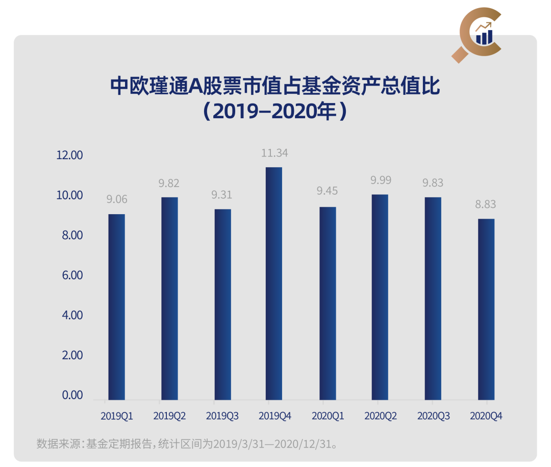 仓位的纪律。产品始终坚守明确的权益仓位中枢。即便在2019—2020年这样的“权益大年”中,其权益仓位也未曾大幅偏离中枢。根据基金定期报告统计,中欧瑾通A在2019—2020年,股票市值占比保持在10%的中枢上下。这种对“风格漂移”的自觉抵制,从根本上规避了因追逐热点而带来的不确定性。