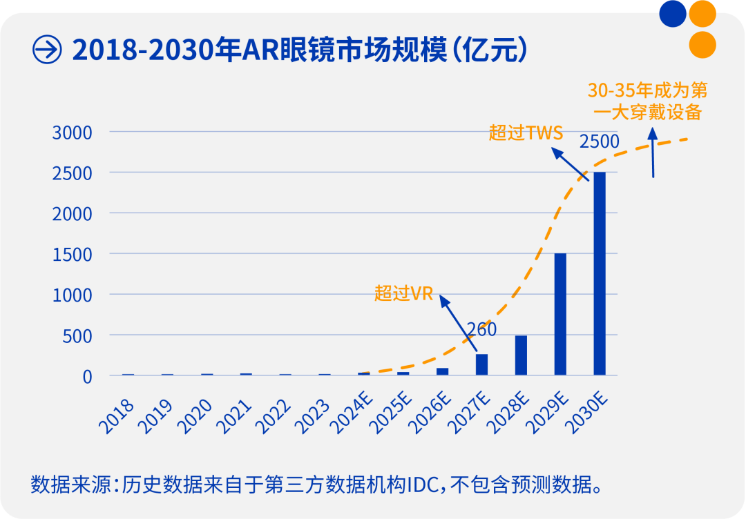 以AR眼镜为例,未来10年,AR眼镜将经历几个重要的发展阶段,迎来更大市场空间。到2027年,AR眼镜将形成明确的功能定位和客户群体;到2030年,大厂将频繁推出新产品,争夺可穿戴设备的入口;到2035年,AR眼镜有望成为全球第一大可穿戴设备,日均佩戴时长超过4小时。在这个过程中,光学技术的创新将成为关键,相关供应链企业将迎来巨大的市场机会。