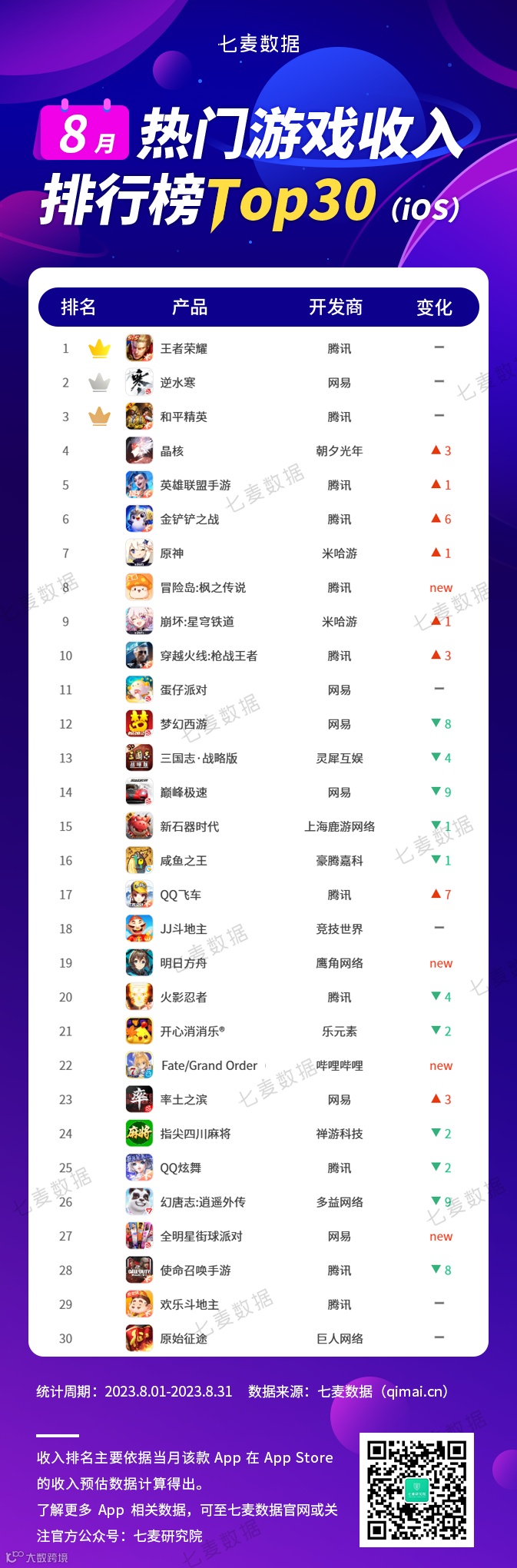 七麦数据发布 2023 年 8 月热门游戏排行榜,其中包括热门游戏下载榜 Top30、热门游戏收入榜 Top30。临近开学季,不少手游迎来了暑期档最后一波“冲刺”,我们来看看都有哪些手游做出了不错的成绩~