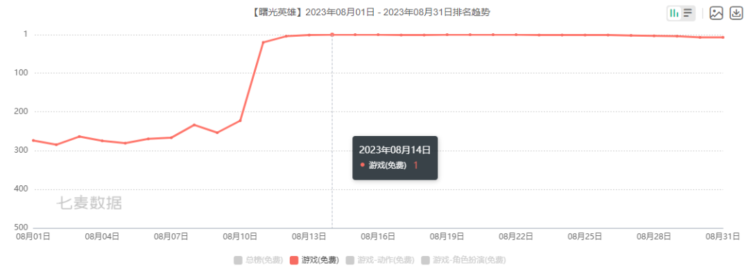 竞技世界旗下的「曙光英雄」,作为一款 2020 年就已经上线了的老牌手游,8 月初其迎来了破圈式爆发增长,在 App Store 游戏免费榜排名突然从寂寂无名的“200+”直线上升,于 8 月 14 日成功登顶并蝉联数日。