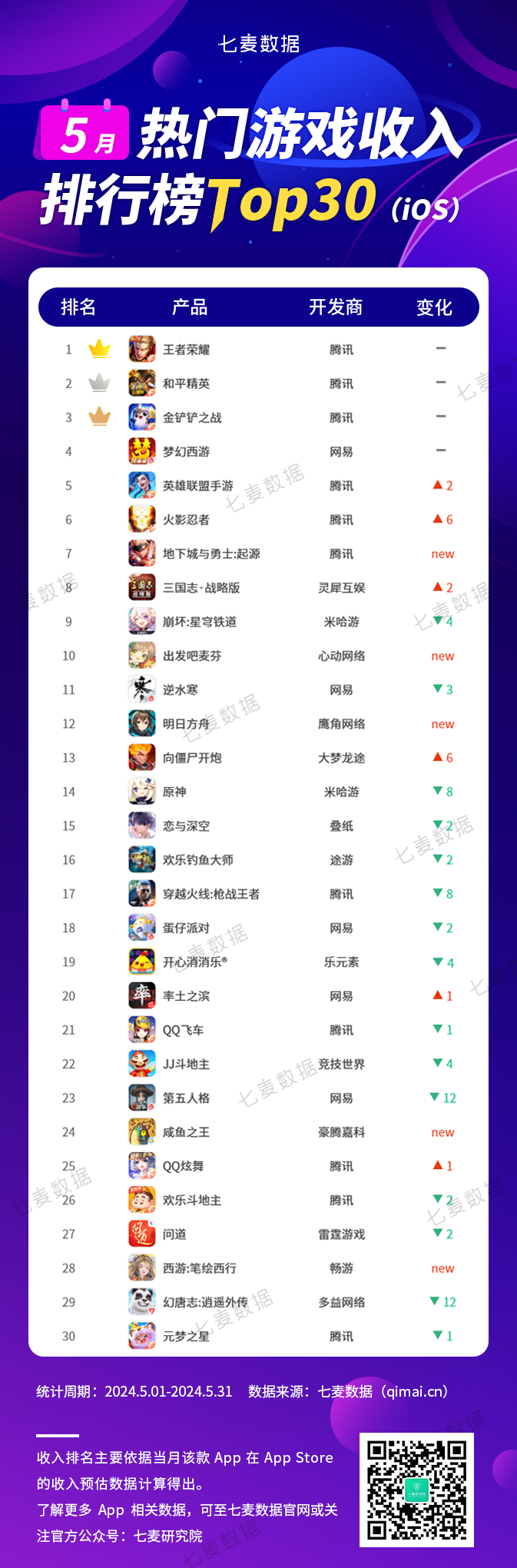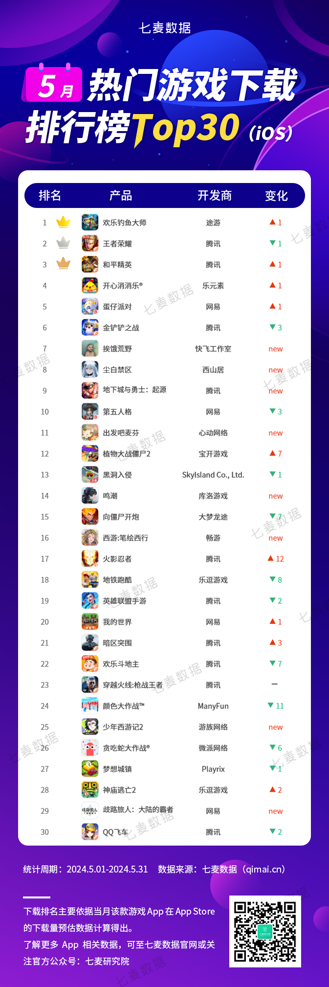 以上就是 5 月的热门游戏榜单 Top30 啦,能明显感觉到各大厂商已经为了接下来的暑期档摩拳擦掌了,随着暑期档临近,后面是否还会有更多“黑马”横空出世呢?我们一起期待~