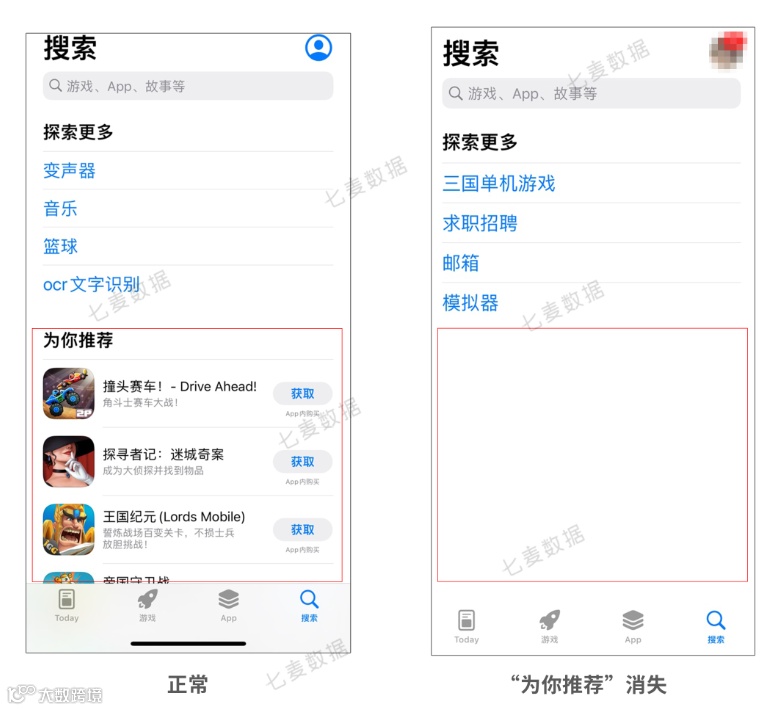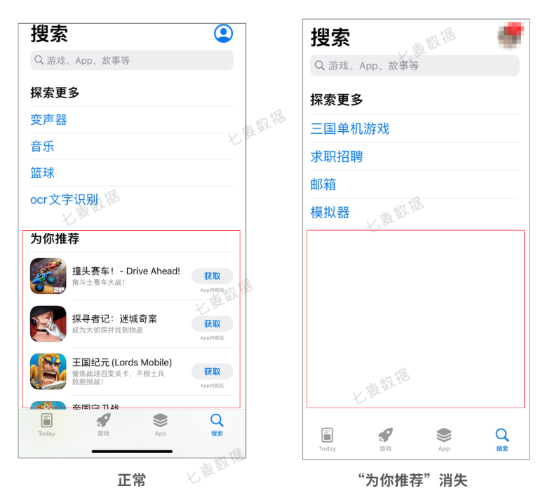 今日,七麦研究院观察到中国大陆地区App Store热搜下方的“为你推荐”版块消失不见了: