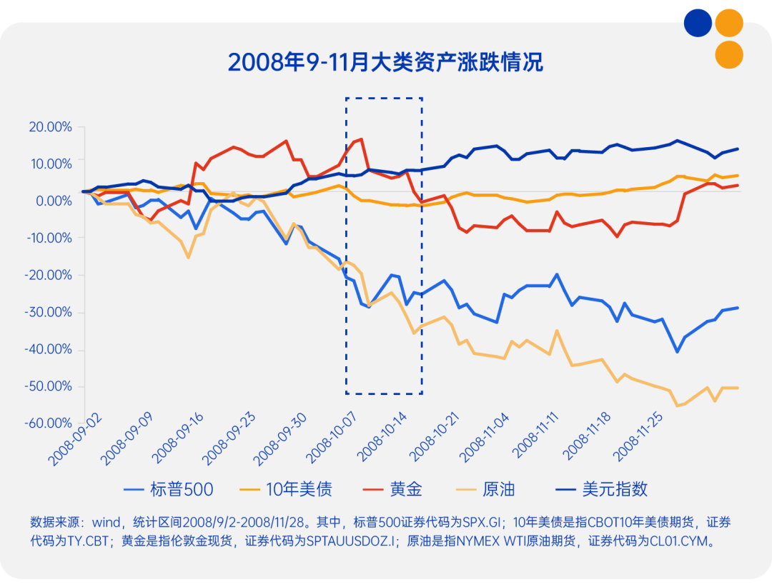 2008年金融危机以雷曼兄弟破产为引爆点,随后美银收购美林、AIG获政府850亿美元紧急注资等事件接连发生,市场信心彻底崩溃。以标普500指数和WTI原油为代表的风险资产大幅下跌,而具有一定避险属性的资产,如美债和黄金价格明显上涨。