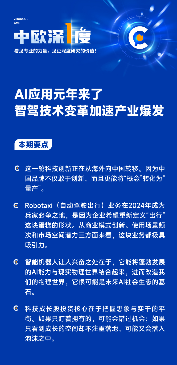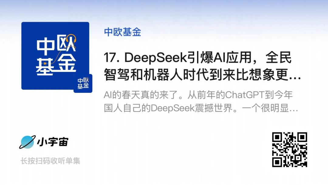 从日常生活的衣食住行,到你学习工作思考乃至认知这个世界的方式,都在被AI悄悄改变。如果你正好对AI感兴趣,那么推荐你来听听中欧基金最新一期播客,我们邀请到了中欧基金基金经理冯炉丹和类星频道主理人郑晓康一起迎风畅聊AI,两位嘉宾一个半小时的如数家珍,会让你有种同频的畅快;如果你对AI还知之甚少,那么这期的播客也是为你而录,全程关于智能驾驶、人形机器人的硬核科普和投资干货,让AI不再只是个抽象的科技名词。