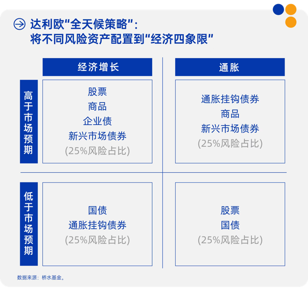 全球知名投资巨头桥水基金的创始人达利欧,曾提出「全天候策略」,旨在免受经济不可预测的波动的影响,使组合在任何「季节」都能表现良好。