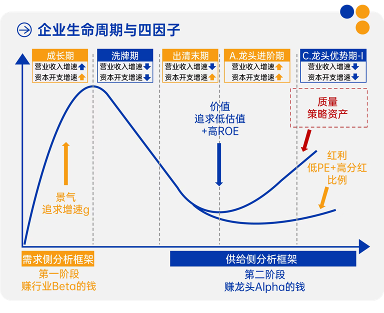 我们的四象限中有质量、价值、红利、景气四个因子,我们希望每个因子中的资产的收益是长期有效的,而底层逻辑则是企业的生命周期。