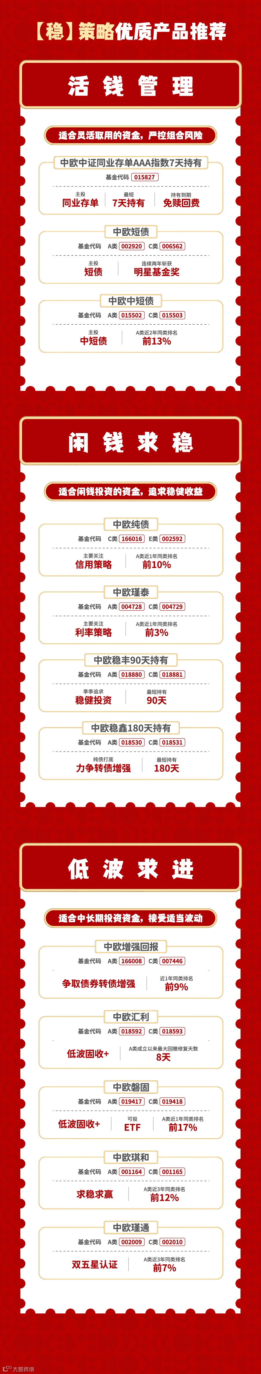 风险提示:基金有风险,投资需谨慎。以上内容仅供参考,不预示未来表现,也不作为任何投资建议。其中的观点和预测仅代表当时观点,今后可能发生改变。未经同意请勿引用或转载。基金管理人承诺以诚实信用、勤勉尽责的原则管理和运用基金资产,但不保证本基金一定盈利,也不保证最低收益。基金的过往业绩并不预示其未来表现,基金管理人管理的其他基金的业绩并不构成基金业绩表现的保证。您在做出投资决策之前,请仔细阅读基金合同、基金招募说明书和基金产品资料概要等产品法律文件和风险揭示书,充分认识基金的风险收益特征和产品特性,认真考虑基金存在的各项风险因素,并根据自身的投资目的、投资期限、投资经验、资产状况等因素充分考虑自身的风险承受能力,在了解产品情况及销售适当性意见的基础上,理性判断并谨慎做出投资决策。中欧短债、中欧中短债、中欧瑾泰、中欧磐固、中欧汇利、中欧增强回报、中欧纯债、中欧稳丰90天持有、中欧稳鑫180天持有为债券型基金,其预期收益及预期风险水平高于货币市场基金,但低于混合型基金、股票型基金。中欧琪和、中欧瑾通为混合型基金,其预期收益及预期风险水平高于债券型基金和货币市场基金,但低于股票型基金。中欧磐固债券、中欧汇利债券可投资于港股通标的股票。除了需要承担与内地证券投资基金类似的市场波动风险等一般投资风险之外,本基金还面临港股通机制下因投资环境、投资标的、市场制度以及交易规则等差异带来的特有风险。中欧稳丰90天持有、中欧稳鑫180天持有、中欧中证同业存单AAA指数7天持有存在封闭期/最短持有期限,在封闭期/最短持有期限内,您将面临因不能赎回或卖出基金份额而出现的流动性约束。中欧中证同业存单AAA指数7天持有为指数基金,主要采用抽样复制和动态最优化的方法跟踪标的指数的表现,具有与标的指数以及标的指数所代表的证券市场相似的风险收益特征。中欧中证同业存单AAA指数7天持有主要投资于同业存单,存在一定的违约风险、信用风险及利率风险,投资者购买本基金可能承担净值波动或本金亏损风险。中欧中证同业存单AAA指数7天持有采用市值法估值,基金净值随市场波动。一般而言,中欧中证同业存单AAA指数7天持有的长期平均风险和预期的收益率低于股票型基金和偏股混合型基金,高于货币市场基金。中证系列指数由中证指数有限公司编制和计算。关于指数值和成分股名单的所有版权归属中证指数有限公司。