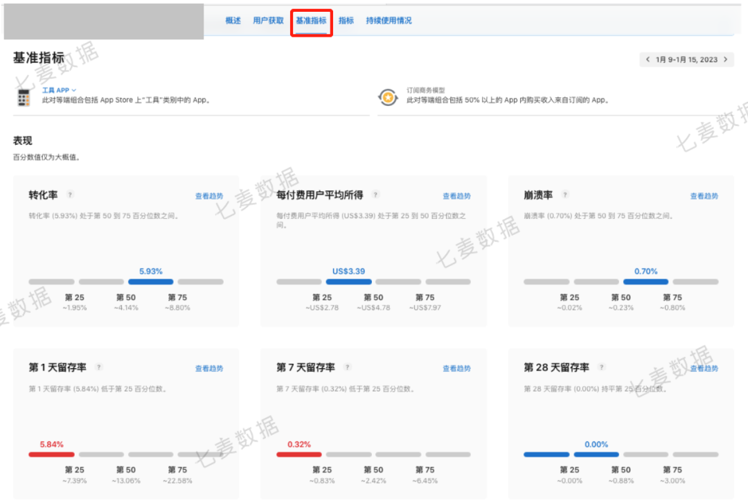 (2)选择要查看的 App 后点击“基准指标”进入概览页,即可查看 App“对等组基准指标”的数据指标,包括转化率、崩溃率、每付费用户平均所得及留存率 4 大数据指标,其中留存率支持查看第 1 天、第 7 天和第 28 天的留存率: