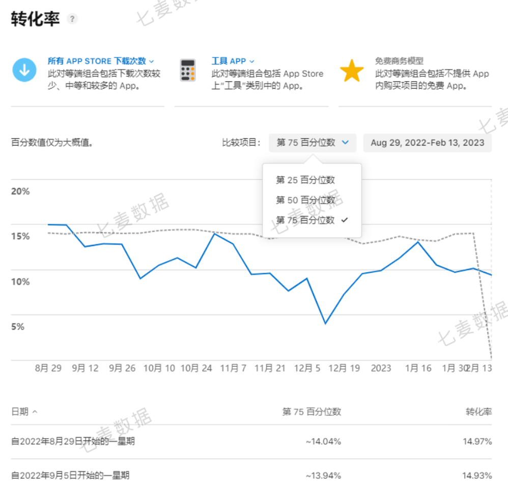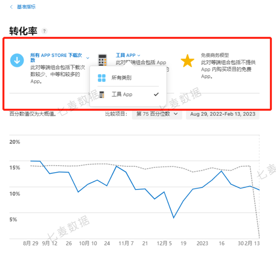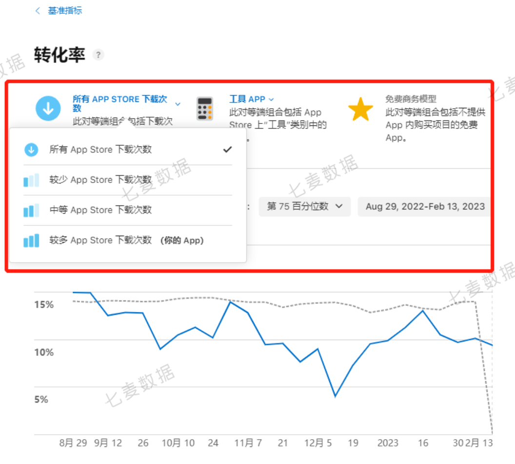 (3)选择不同的指标旁边的“查看趋势”,还可以进入该指标的详情页,通过不同的维度和时间周期查看具体数据。如下图,以查看转化率的趋势为例,开发者可以选择查看组内第 25、50 和 75 百分位数的转化率趋势,并与自己的 App 进行对比: