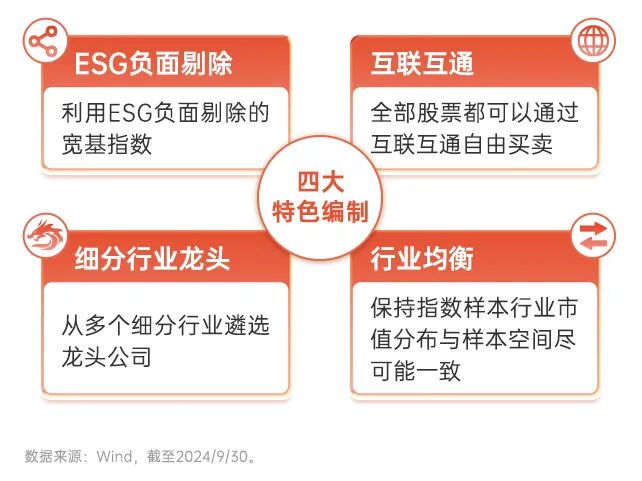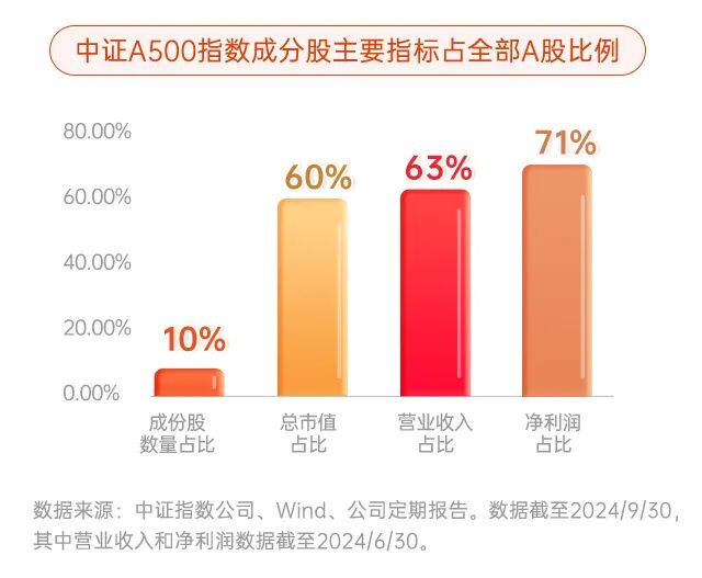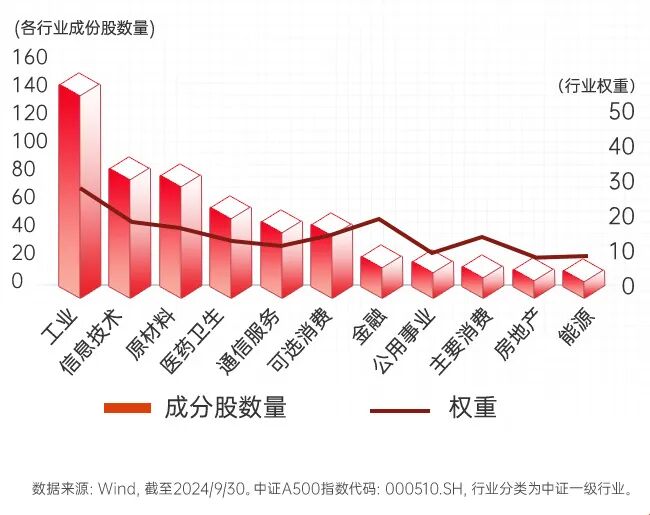 首先,它是一只贴近中国经济核心产业体系的指数,中证A500指数成份股总市值超过全部A股总市值的一半,涵盖了国民经济的重点行业,且契合经济结构调整与产业升级的趋势,或更能多维度刻画中国经济转型升级背景下核心资产的整体表现。(数据来源:Wind,截至2024/9/30)