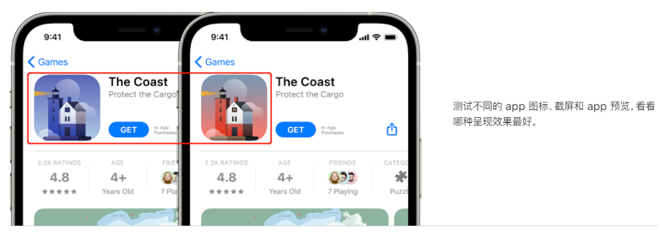 在产品详情页优化方面,苹果还做了一项重大更新:开发者可以在默认的App Store产品页面中为App尝试不同的图标、截图和视频预览,来对比这些素材的效果,了解用户的喜好。