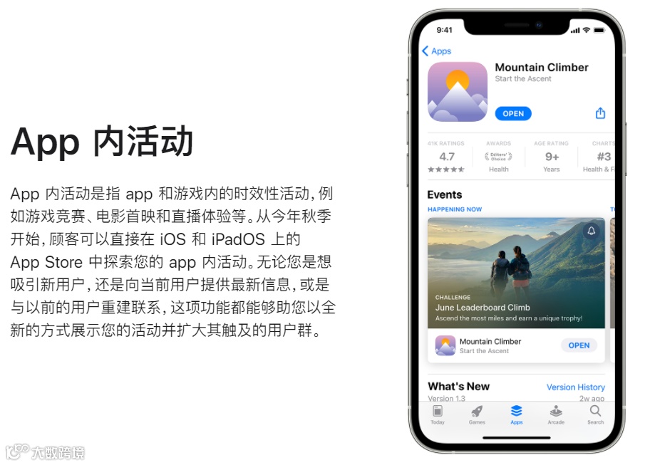 App内活动可以独立于新的App版本提交审核,最多可创建10个App内活动,且一次最多可以在App Store内发布5个;