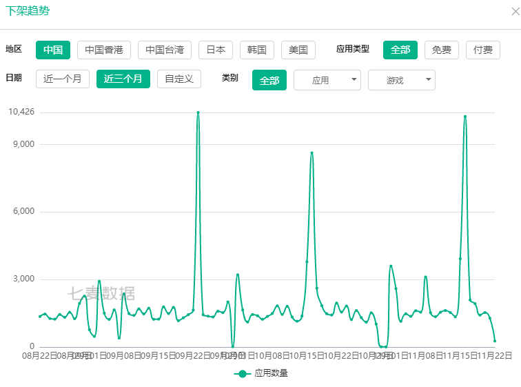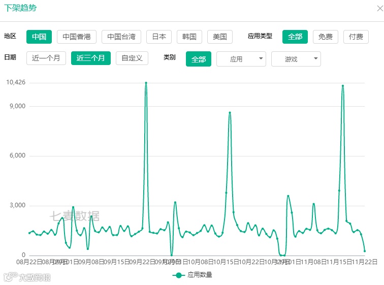 上周的下架 App(含重新上架)数量共 22279 款,相比前一周增加了 10455 款,其中应用下架 20153 款,游戏下架 2126 款。此次下架App中仍是应用居多,根据七麦数据以往下架App数量监测经验来看,此次为苹果对App的常规清理,与最近沸沸扬扬的“休闲游戏”下架问题并无太大关系。