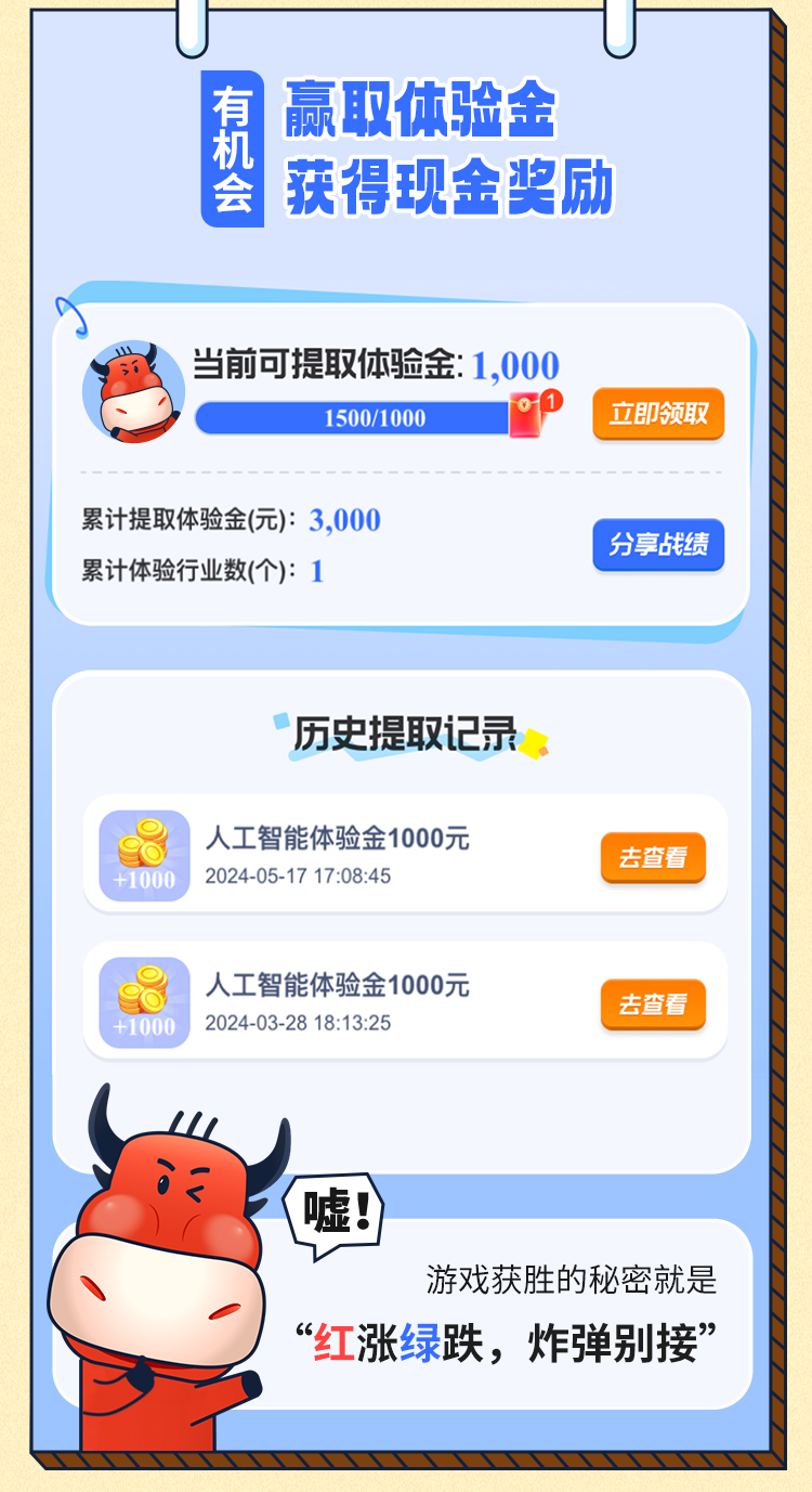 体验金是根据基金交易规则模拟基金的申购、收益产生及发放等过程的虚拟体验资金,为虚拟金额,未发生真实交易,仅供体验,体验流程不涉及基金开户、申购及任何资金流变动。您在虚拟体验时,需注意自身的风险承受能力和基金的风险评价。真实交易应在完成风险测评后、根据自身的风险承受能力进行。体验时长以具体体验金说明为准,体验到期后将自动计算体验收益,部分体验金设有奖励上限,若体验期内基金收益超过奖励上限,则仅下发未超过部分奖励;若体验期间收益为负或为零,则无体验收益。体验金奖品提供方为腾讯理财通,用户可通过小程序链接跳转至理财通页面领取,领取后用户可通过(微信-我-服务-理财通]页面的活动入口进入查看体验金体验活动,体验金的详细规则可见理财通平台发布的《理财体验金活动规则》。