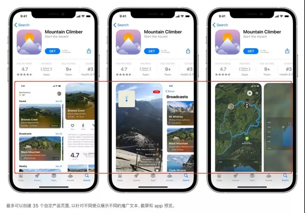 自定义产品页功能主要是用来帮助开发者创建多个版本的App Store产品页面,来展示App内的不同功能或内容(如特定的运动、人物、节目或游戏功能),从而吸引可能对这些内容最感兴趣的用户。