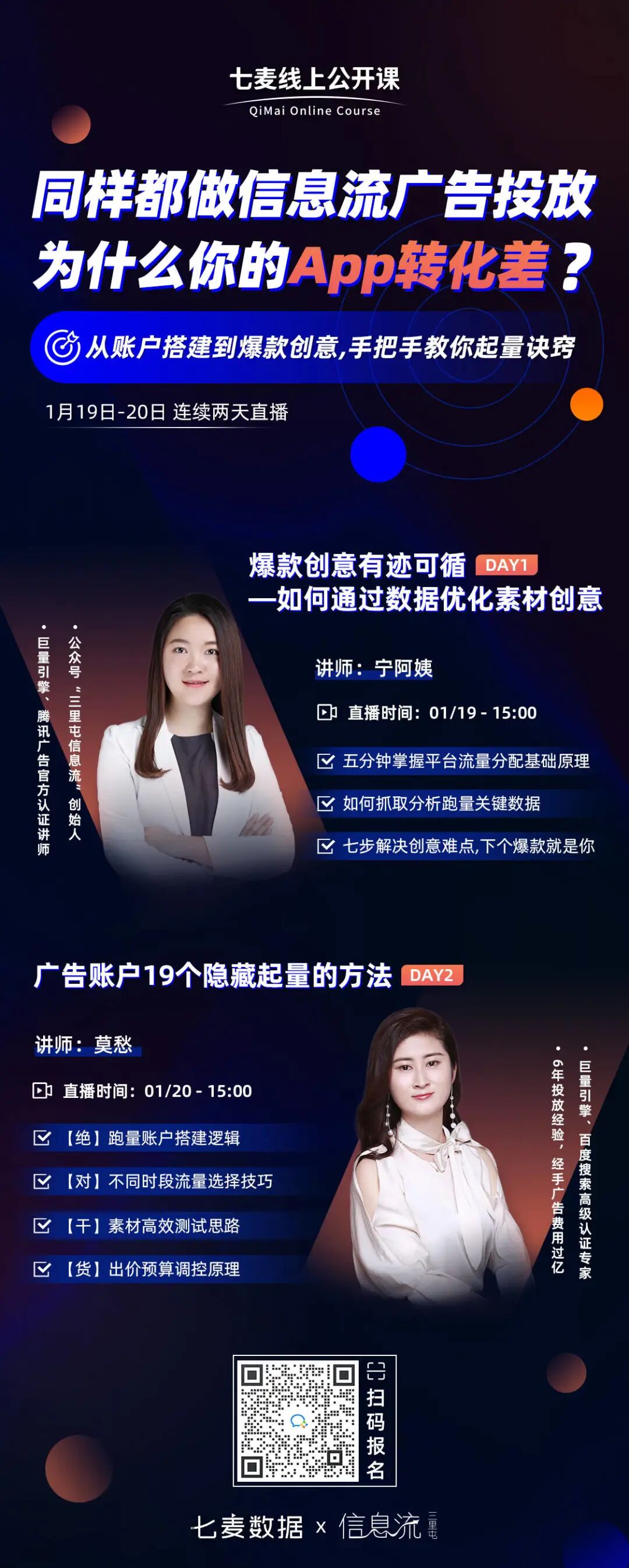 面对种类繁多的信息流广告平台以及错综复杂的推广逻辑,“如何快速系统化入门?” “怎样才能降低成本,打造爆款” “如何提高App转化以及ROI”等成为推广人需要考虑的问题。为了帮助推广人解决这些问题,七麦数据特别邀请了三里屯信息流的宁阿姨、莫愁两位老师,她们将以巨量引擎平台为例,分享从账户搭建到爆款创意的起量诀窍。