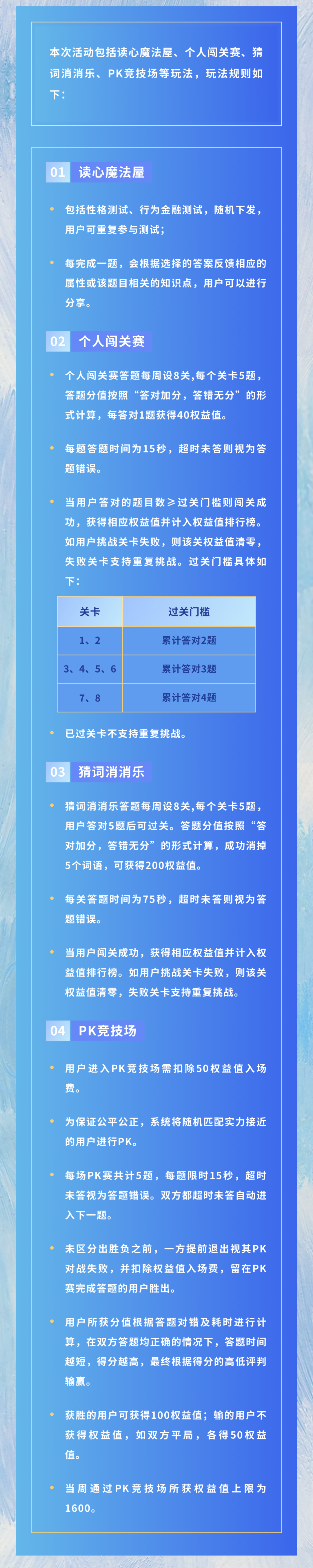 本届活动分为网络初赛和电视决赛两个阶段。网络初赛采用线上答题形式,答题平台于5月15日8点正式面向公众开放,共持续8周。通过“投资者成长营”带投资者领略“读心魔法屋”“个人闯关赛”“猜词消消乐”“PK竞技场”四大游戏玩法!比赛拼脑力,答题学知识!期待投资者通过轻松愉快的方式进一步学习权益知识等相关内容。