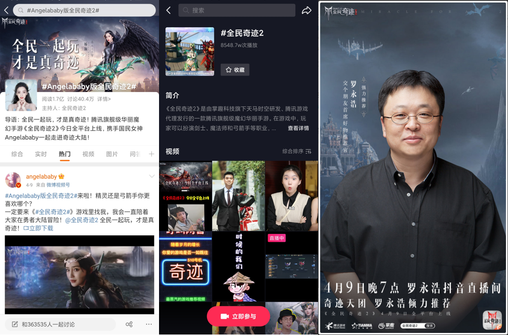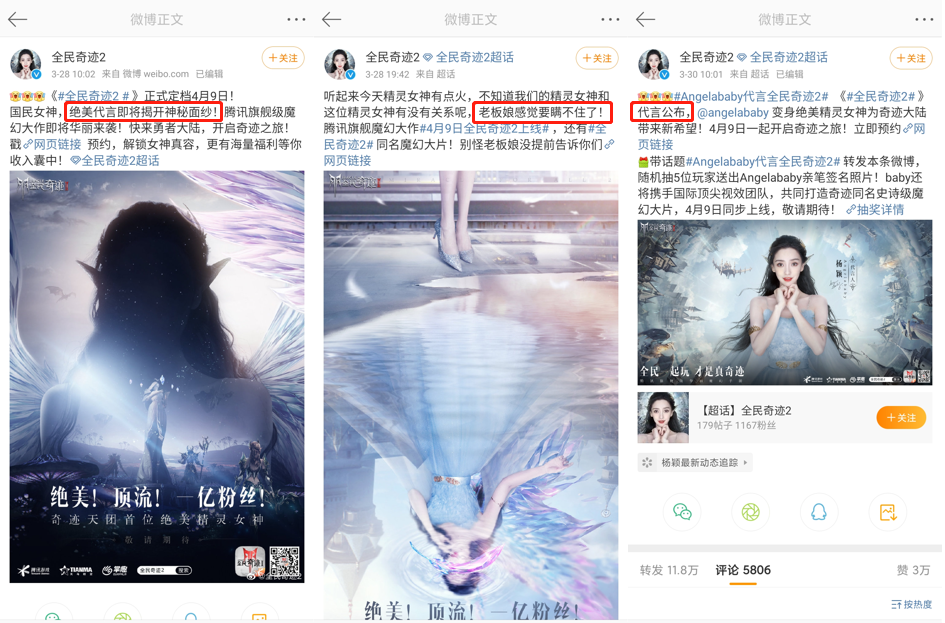 「全民奇迹2」预订期间,就铺设了关于游戏代言人的层层悬念:3月28日-29日,全民奇迹官微连续发布2条微博海报,从背影到倒影,吸引了一波粉丝的关注和讨论。3月30日,微博官宣游戏代言人是国民女神Angelababy杨颖,并发放游戏福利,该条微博获得11.8w次转发,获得了不错的宣传效果。