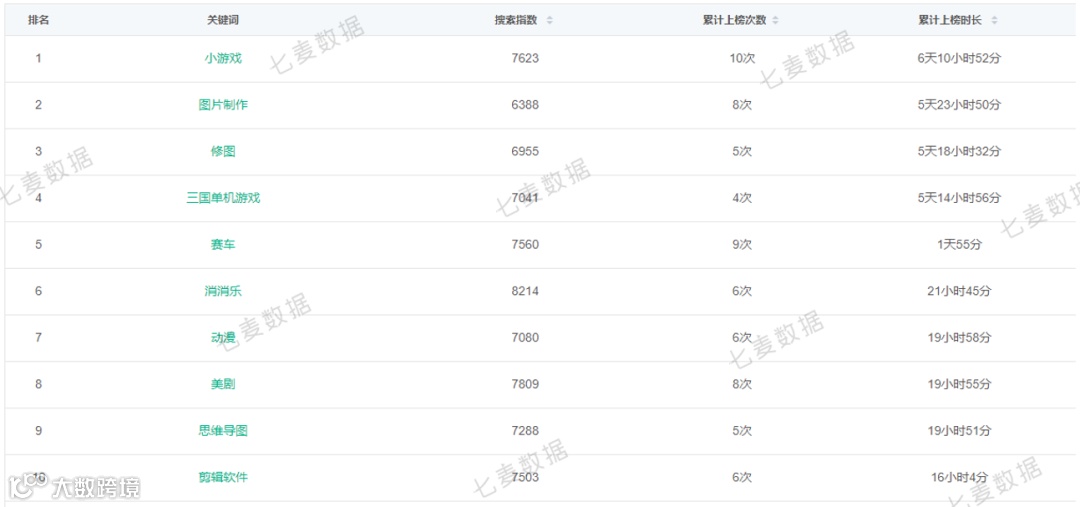 上周一共有 79 个热搜关键词,与上周数量增加了 3 个。其中“小游戏”排名第一,在上周累计上榜时长达 6 天 10 小时 52 分。
