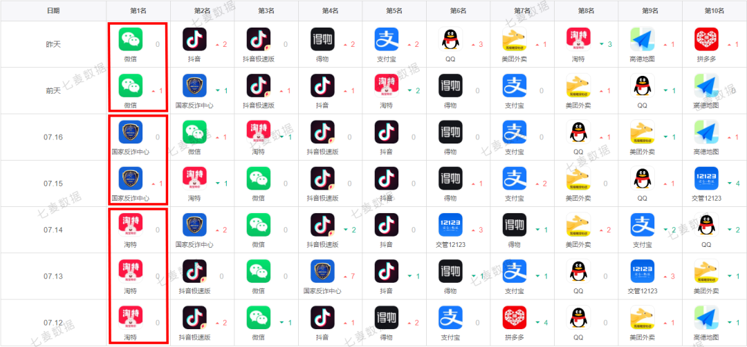 自7月9日「淘特」在应用免费榜霸榜以来,势头一直不减,加上上周排名第一的3天,连续6天占据榜首;随后「拼多多」和「国家反诈中心」接棒各自霸榜两天。