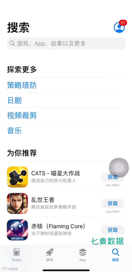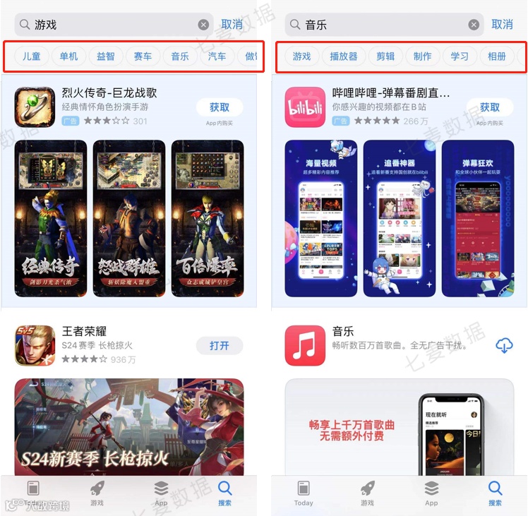 今天,七麦研究院测试发现:在App Store搜索“音乐”“游戏”“剪辑”等关键词后,部分手机的搜索结果页顶部出现了“搜索建议”标签,部分用户也向我们反馈了该现象。“搜索建议”功能疑似在中国大陆App Store上线。